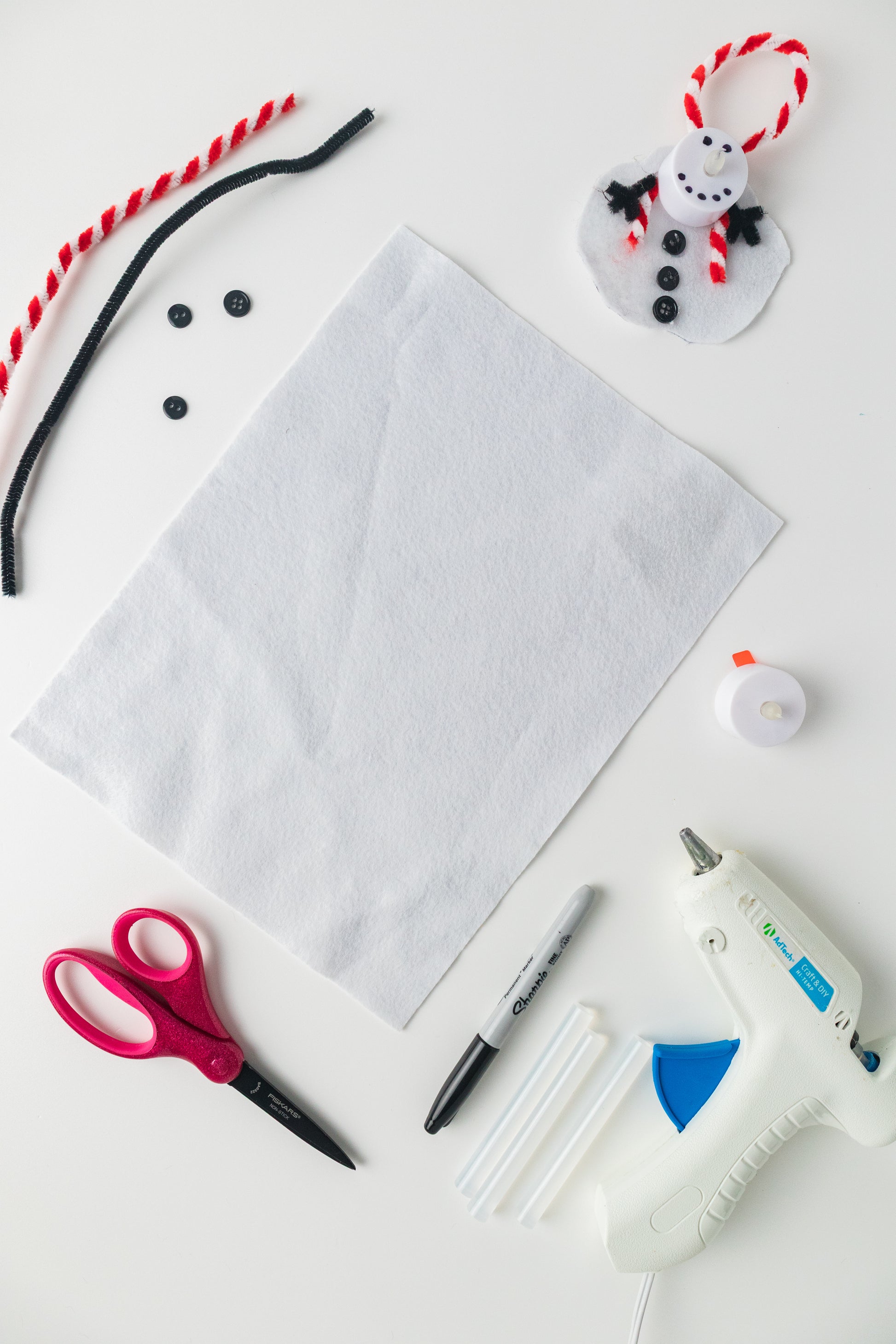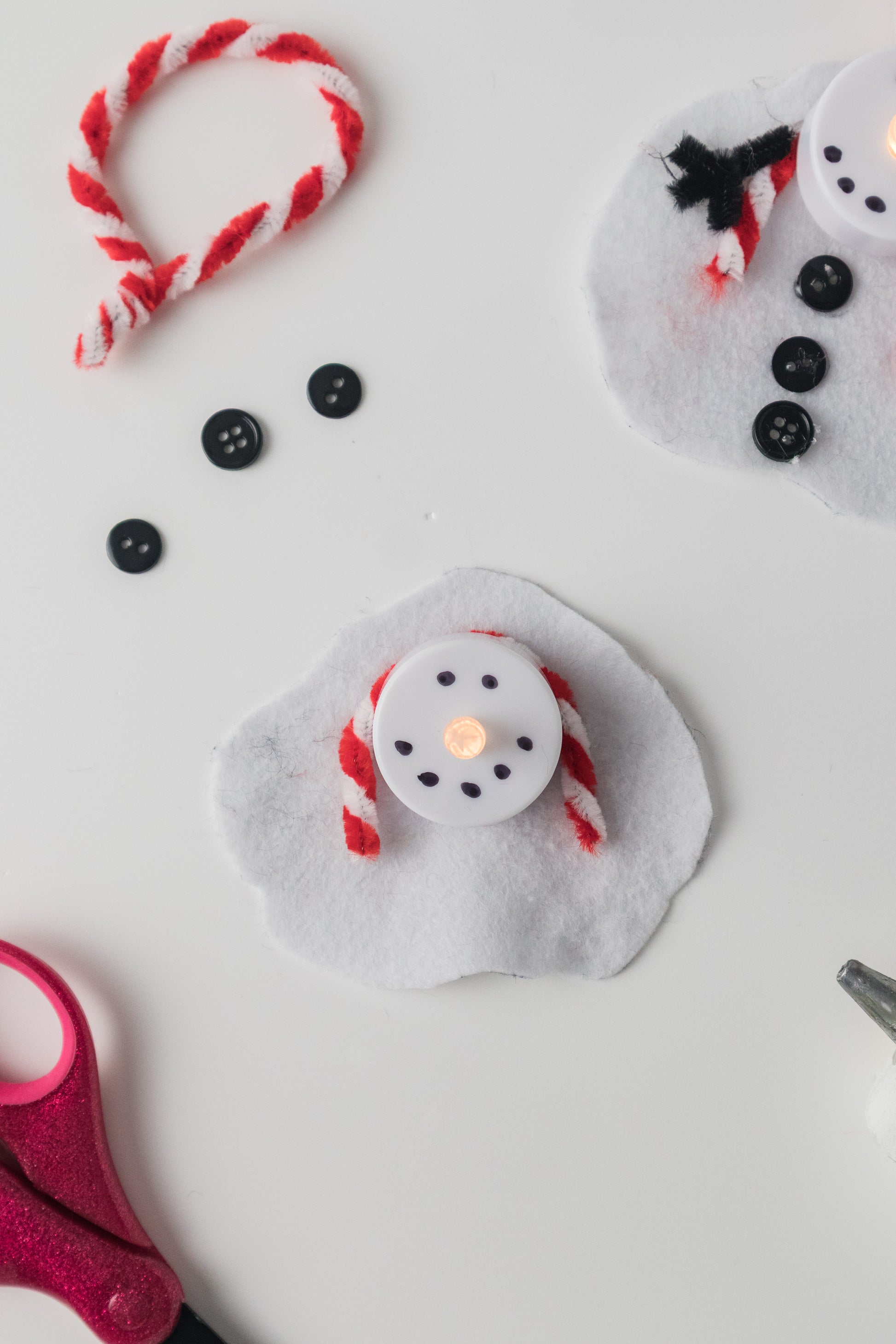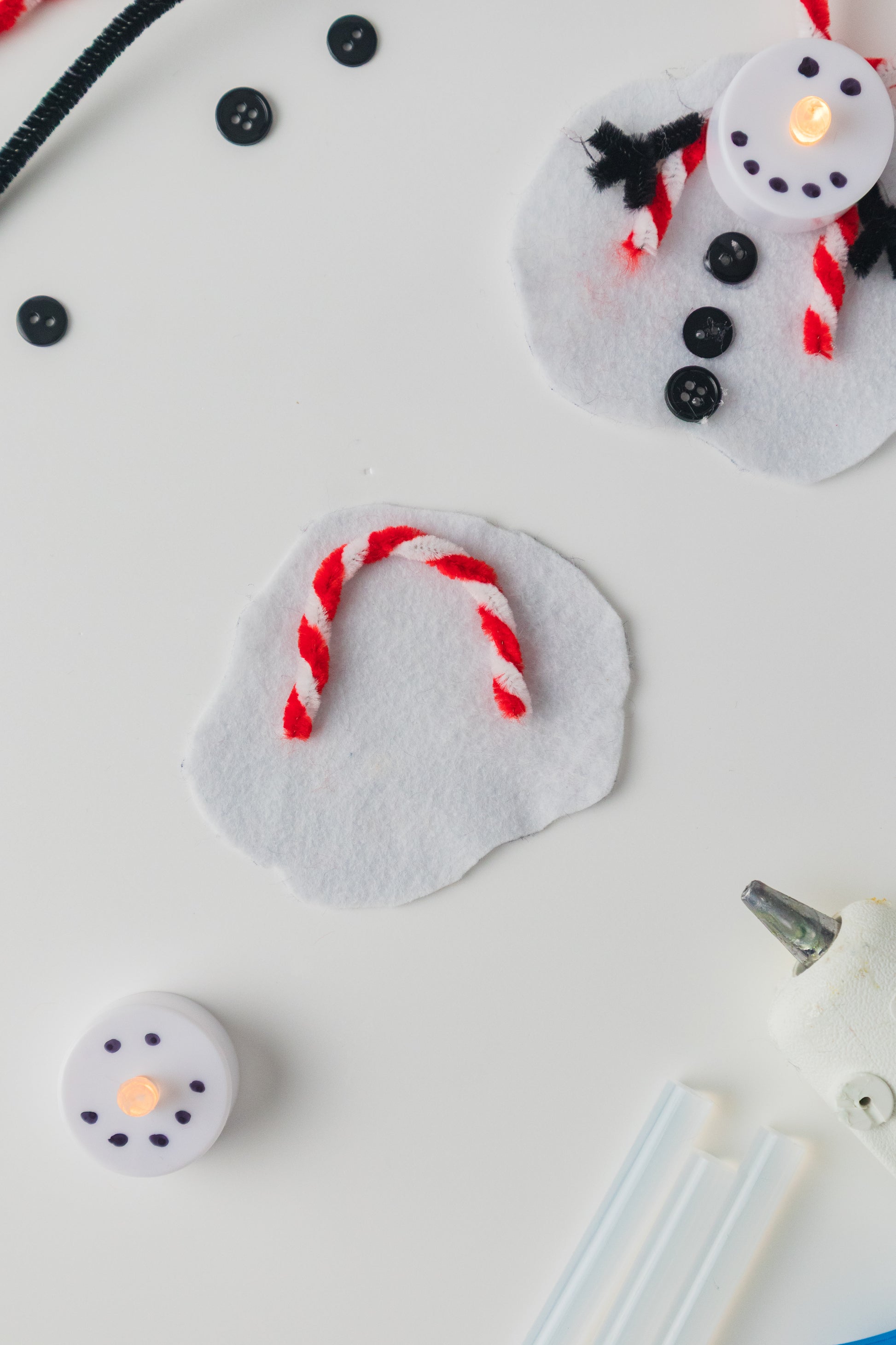 Featured supplies: white battery-operated tea light; white felt; Black buttons; colored pipe cleaners; Black or brown pipe cleaner (for arms); Black permanent marker (like a Sharpie);Hot glue gun and glue sticks; Scissors
