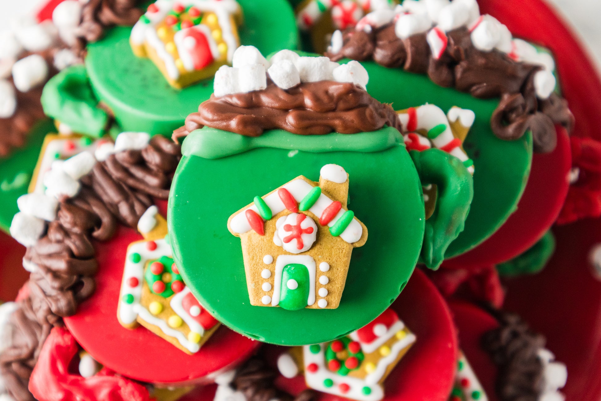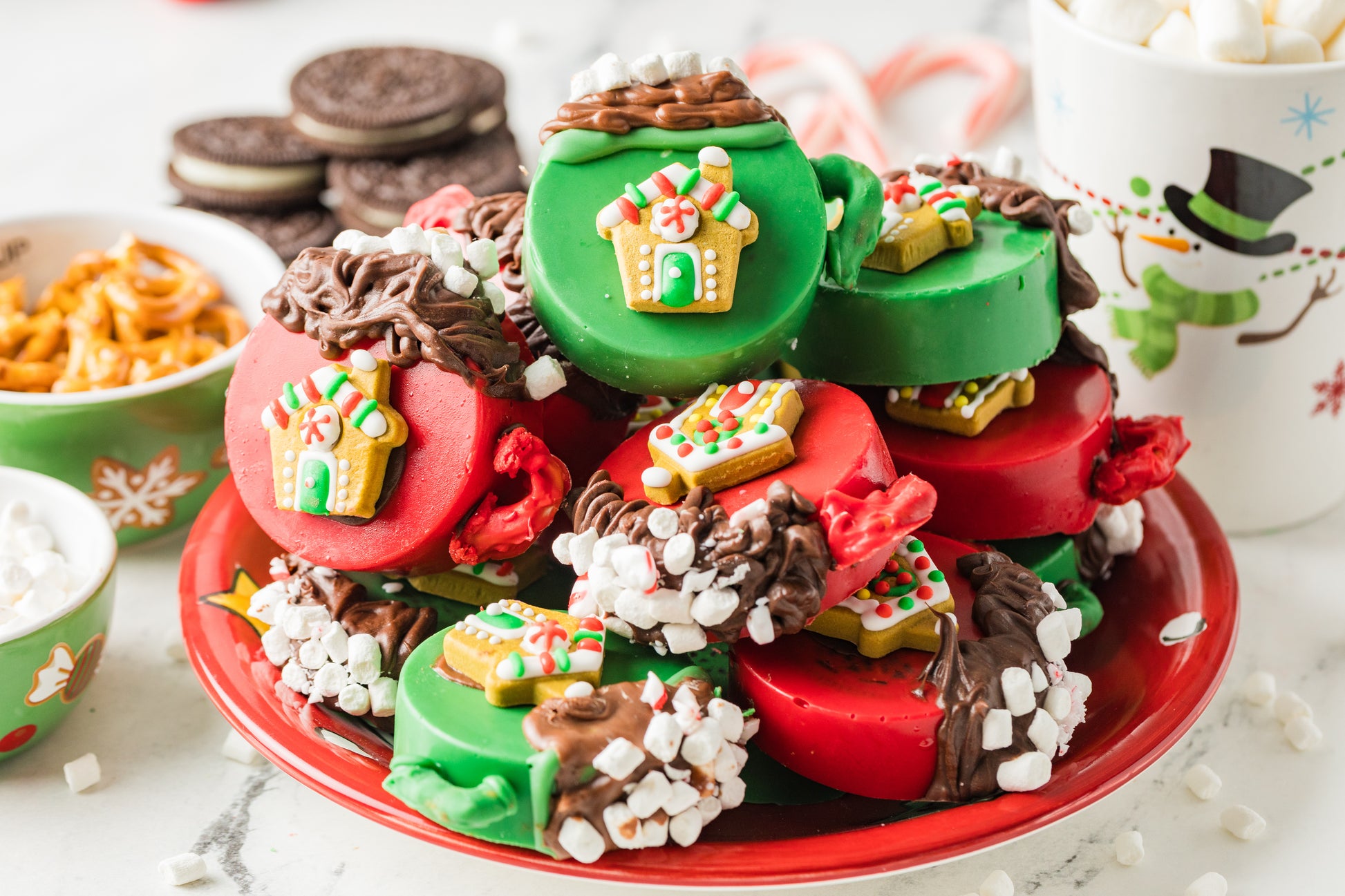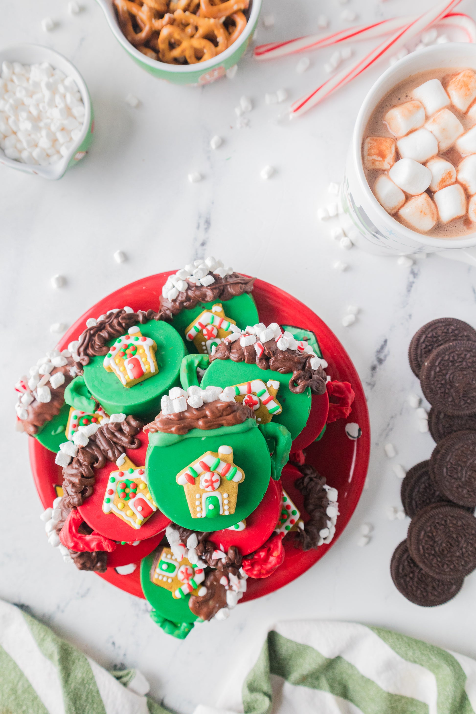 Featured ingredients: Oreos, red/green melting wafers, tiny marshmallows, pretzels, and candy holiday decorations