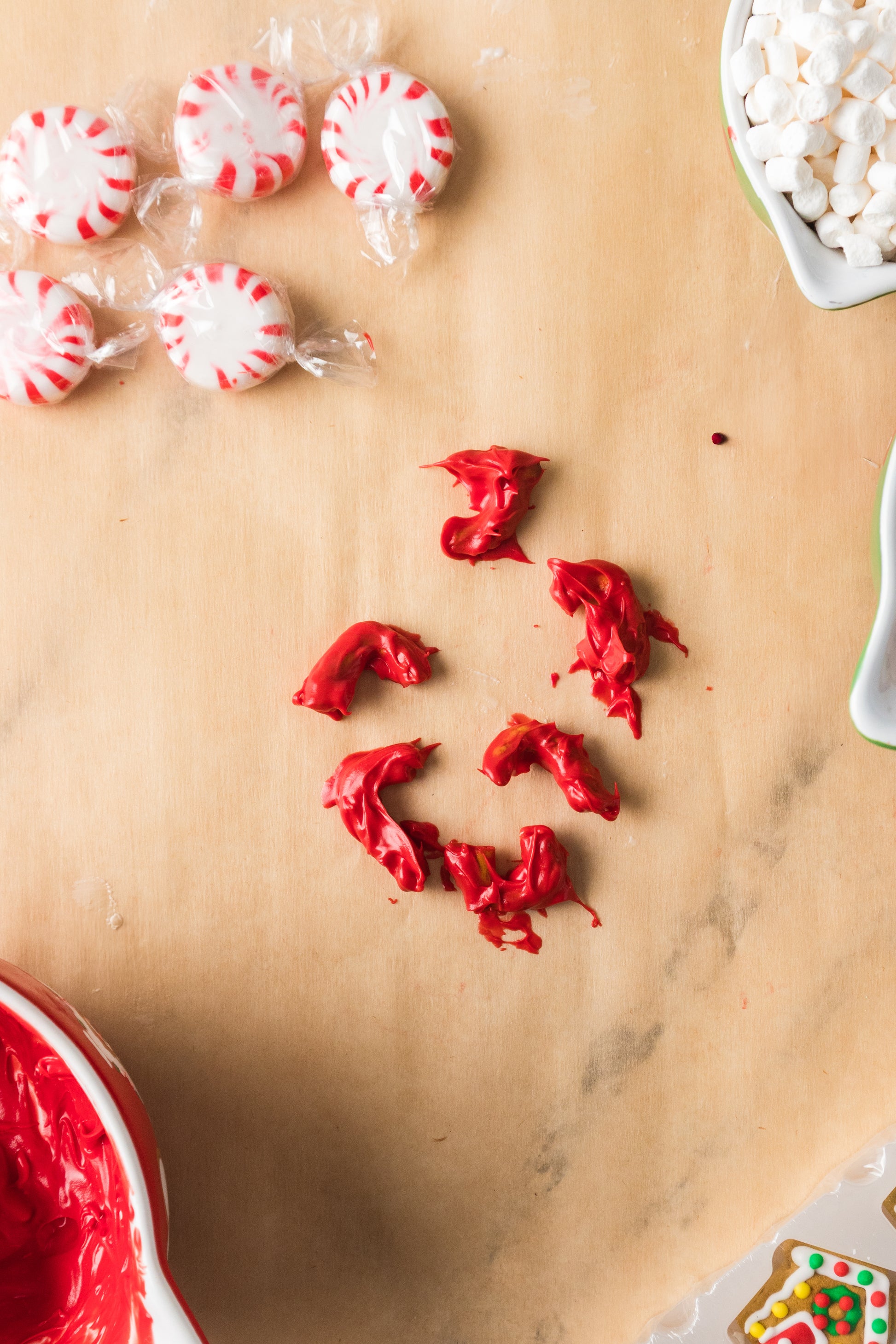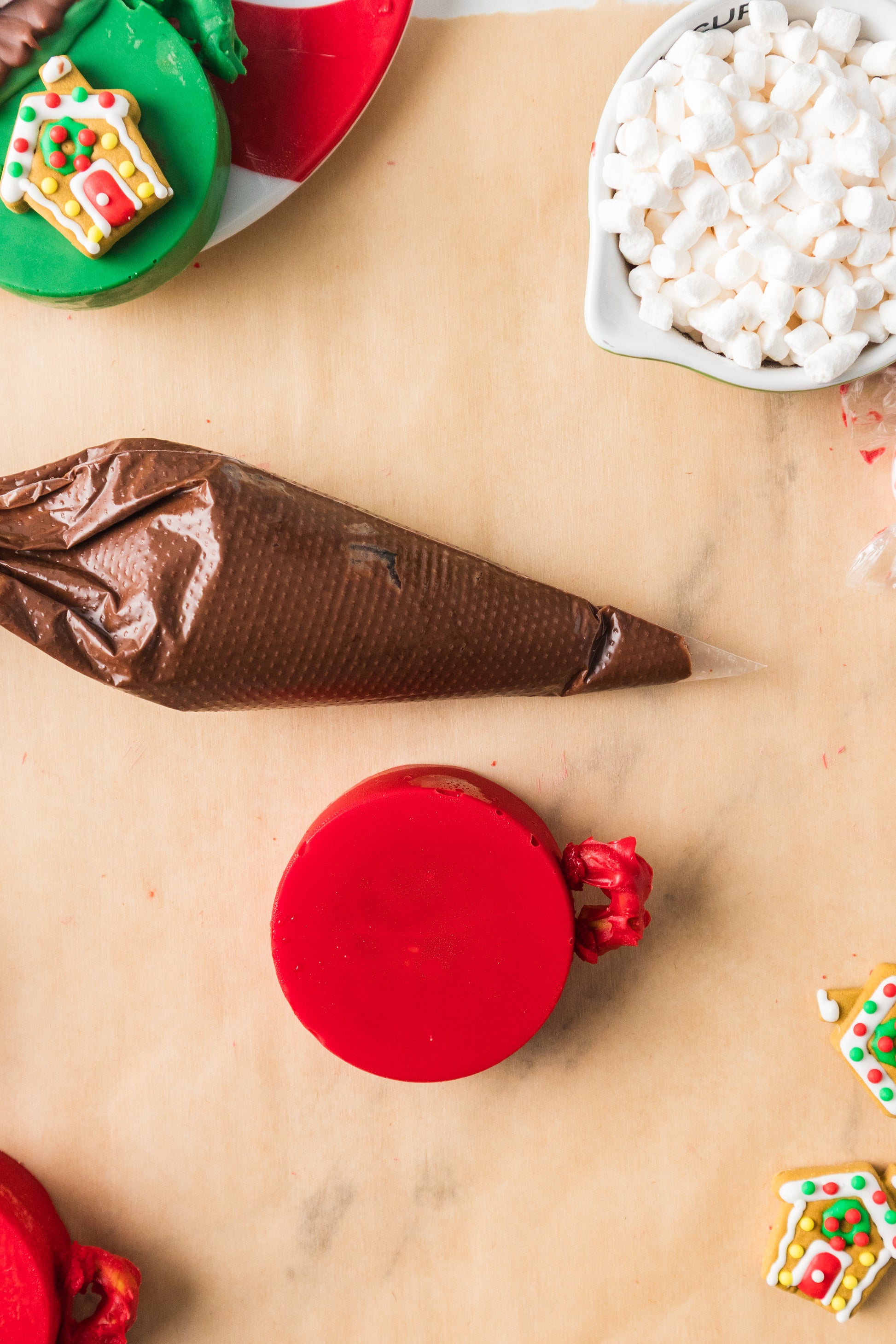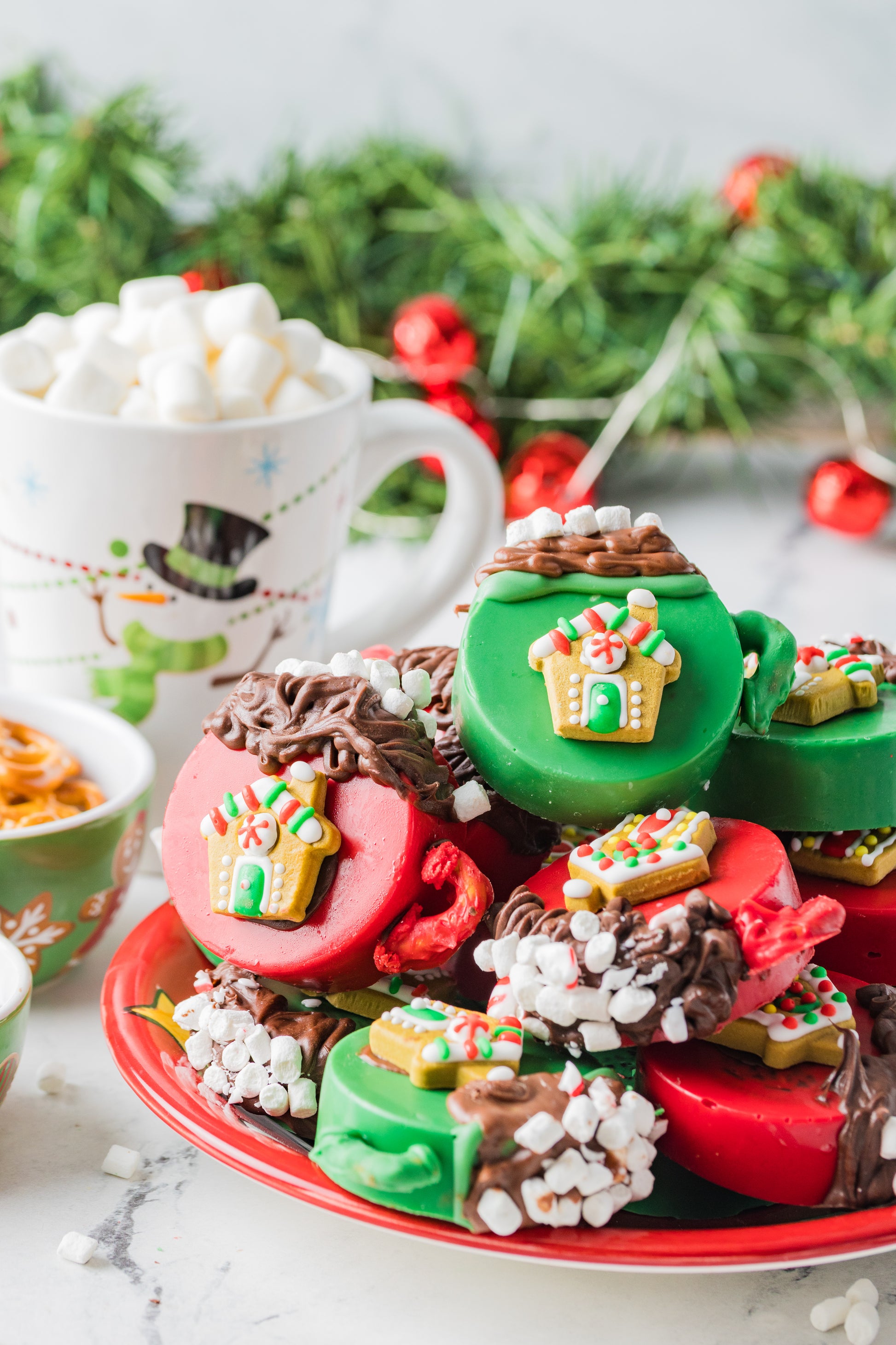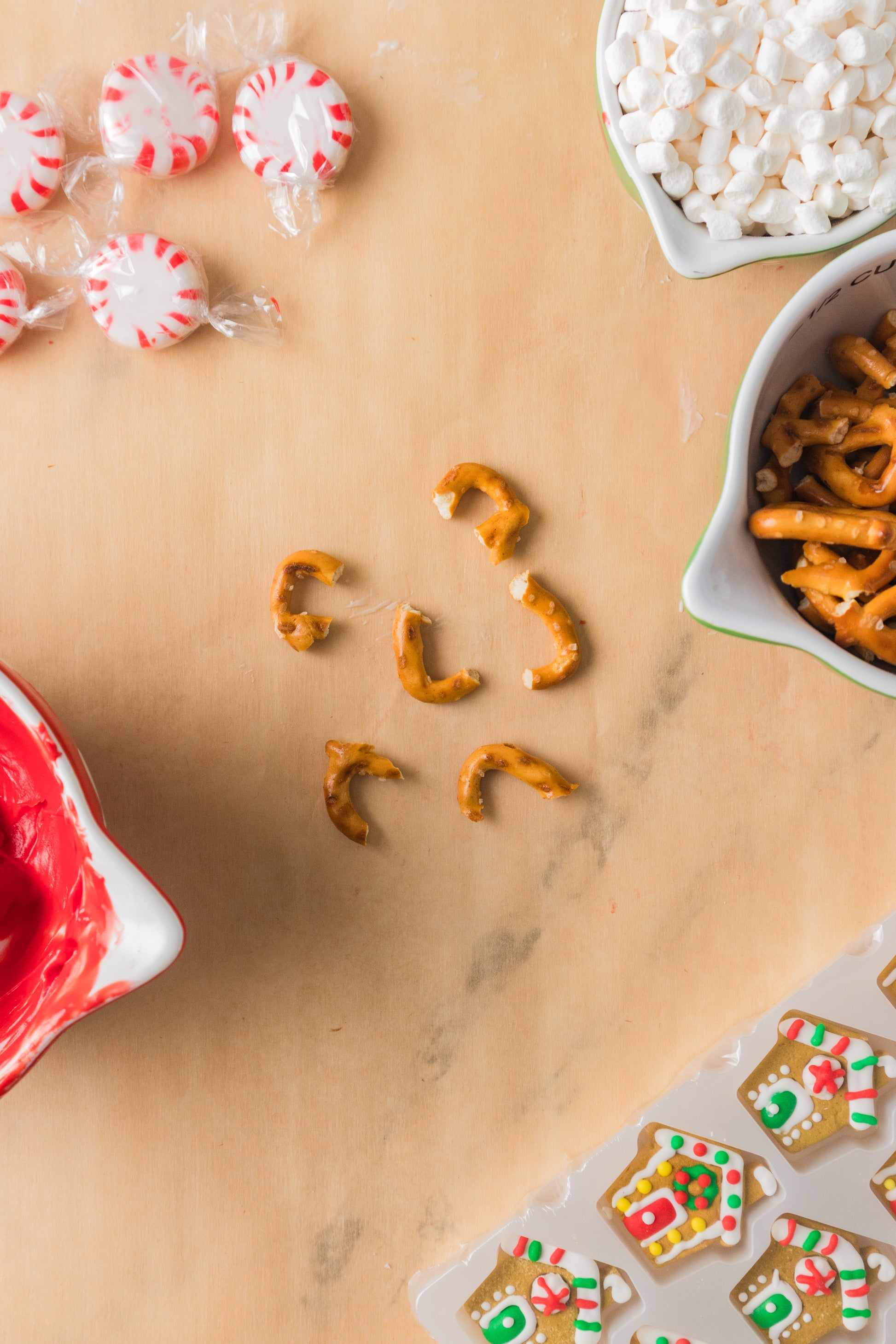 Featured ingredients: Oreos, red/green melting wafers, tiny marshmallows, pretzels, and candy holiday decorations
