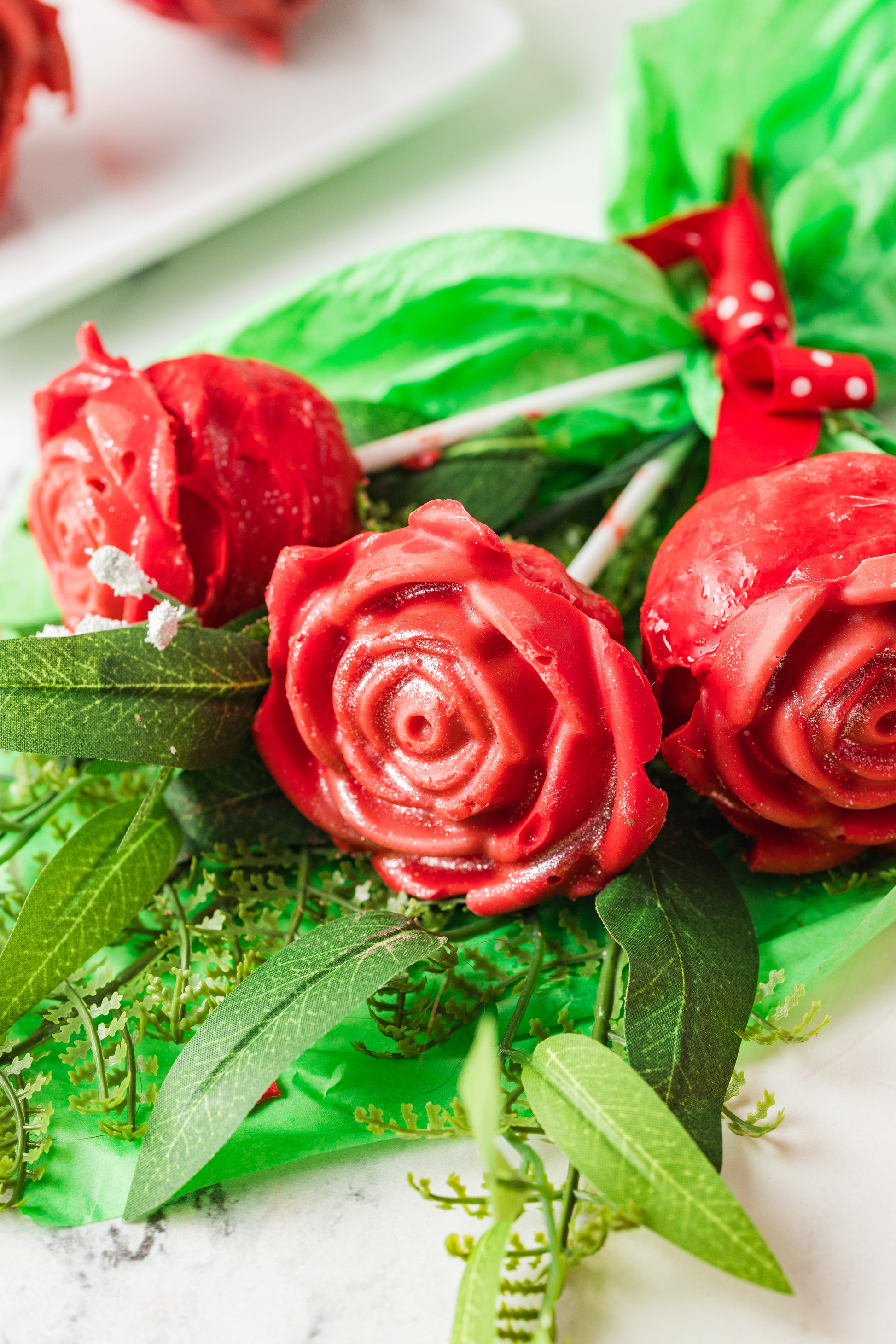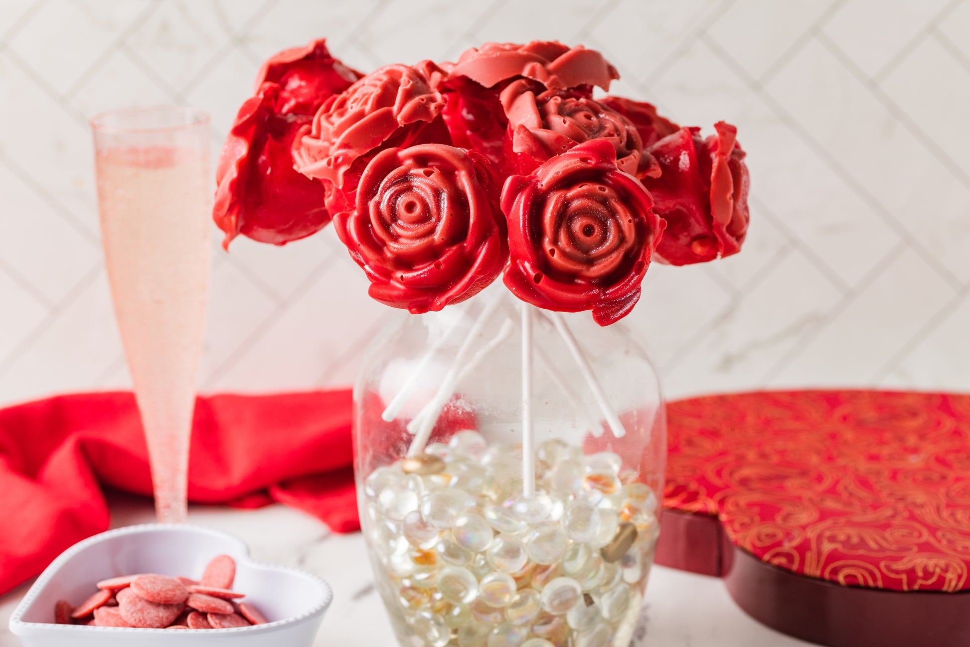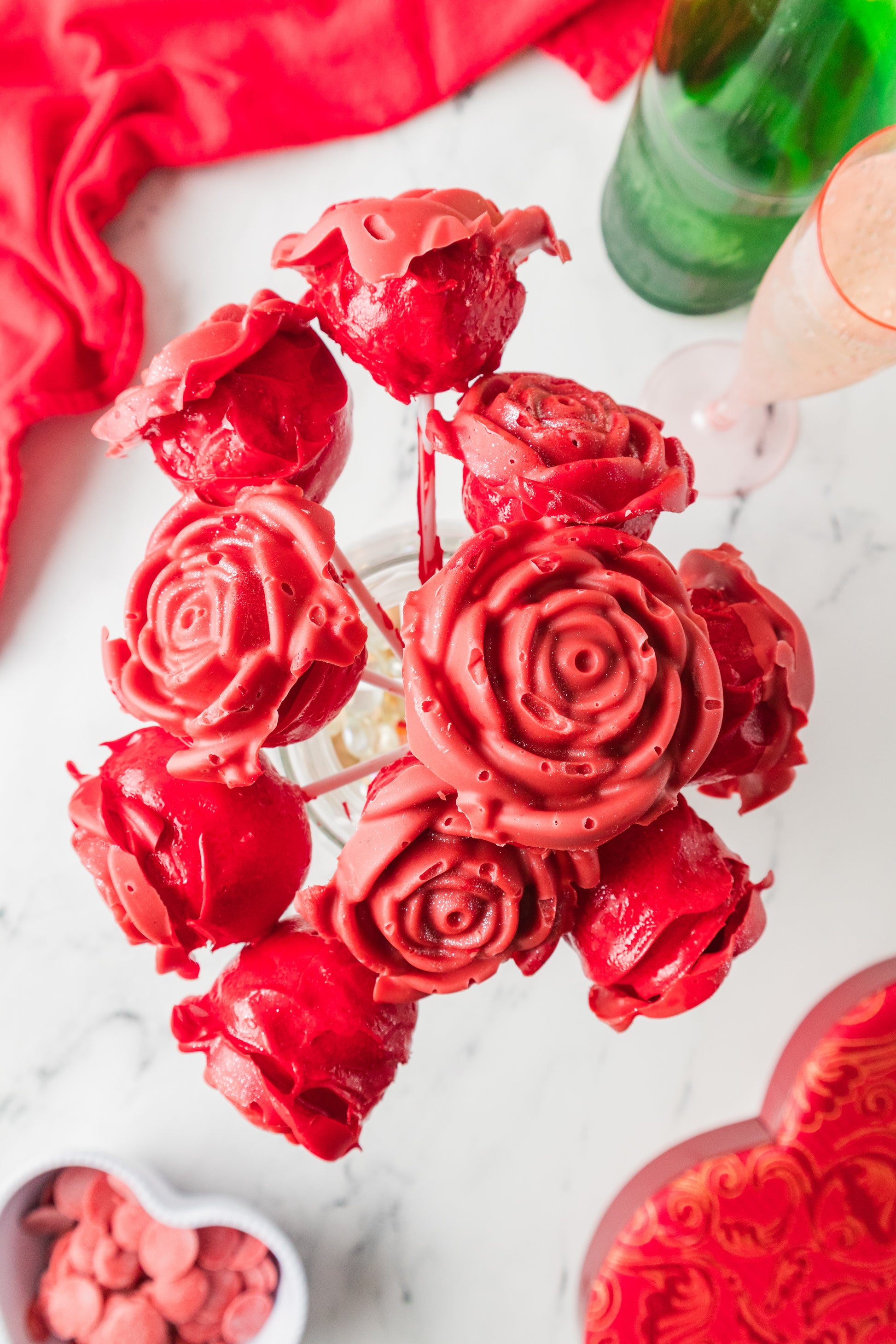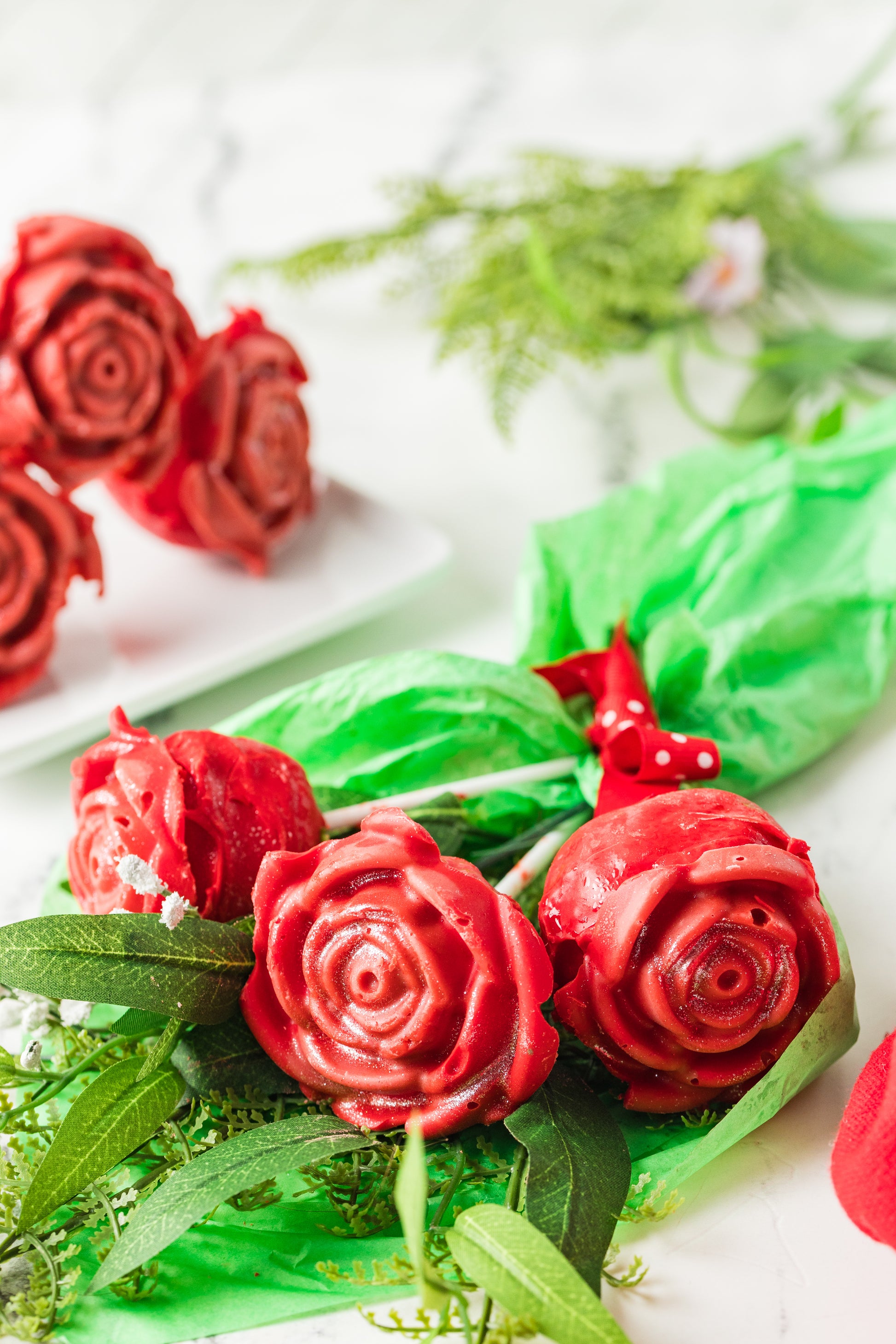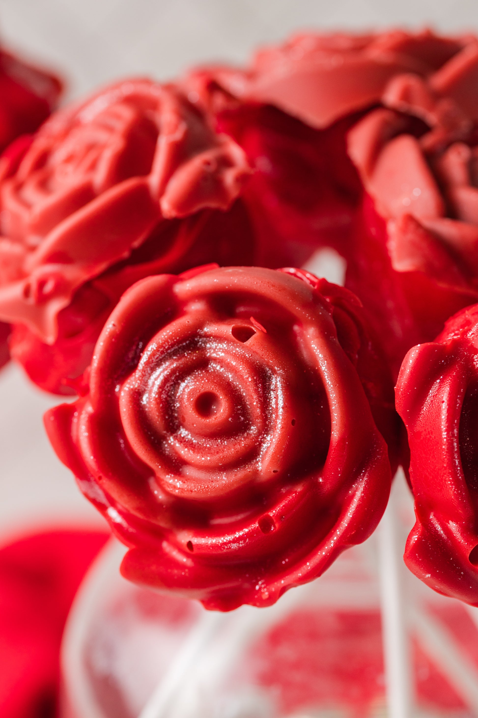 These romantic cake pops start with a freshly prepared pink velvet cake that’s rolled into bites, dipped in red candy coating, and set inside a silicone rose mold for a beautiful, three-dimensional flower effect. Once firm, each rose pop is dusted with edible red glitter for a sparkling, show-stopping finish.