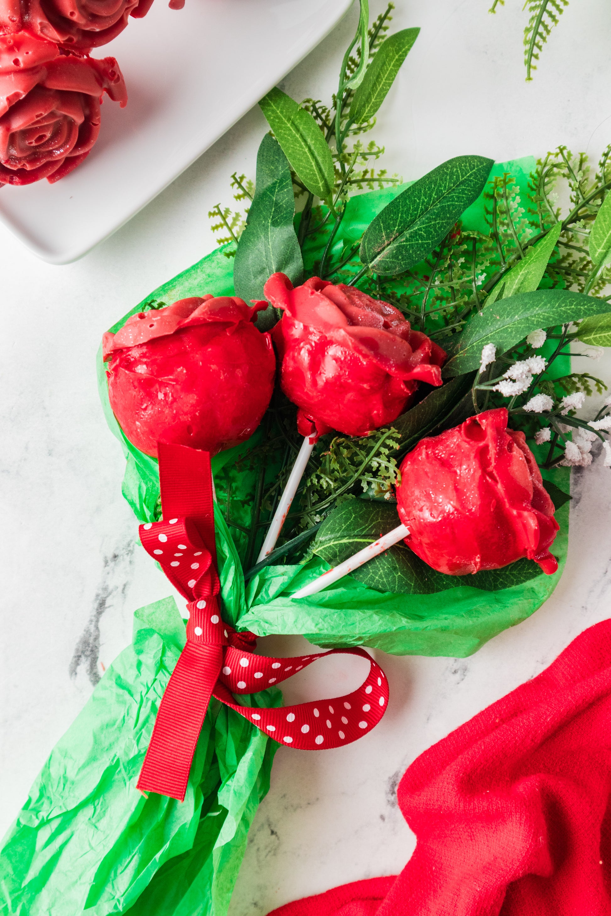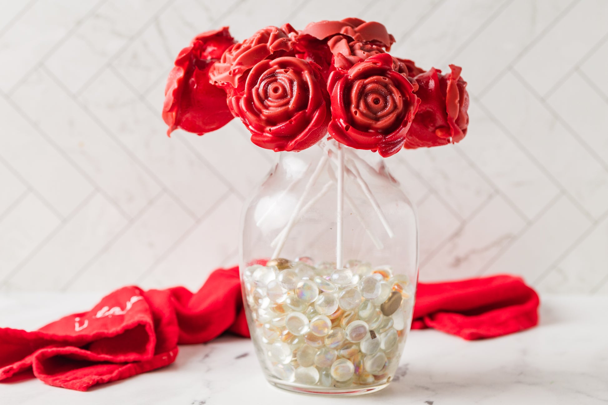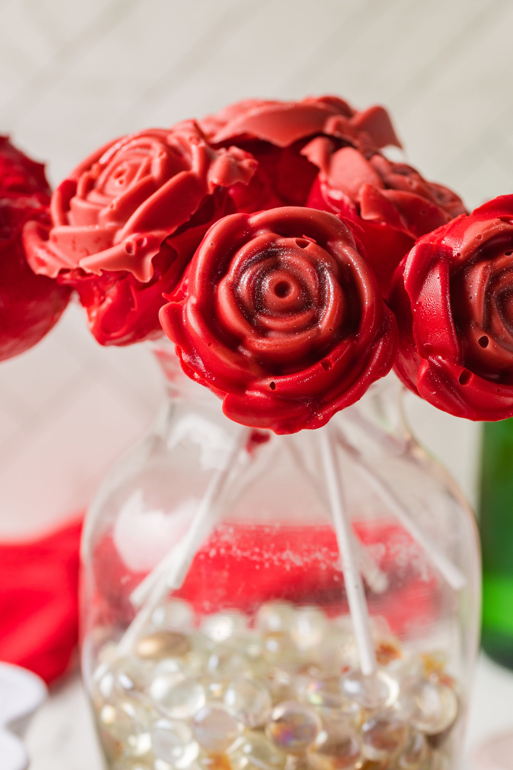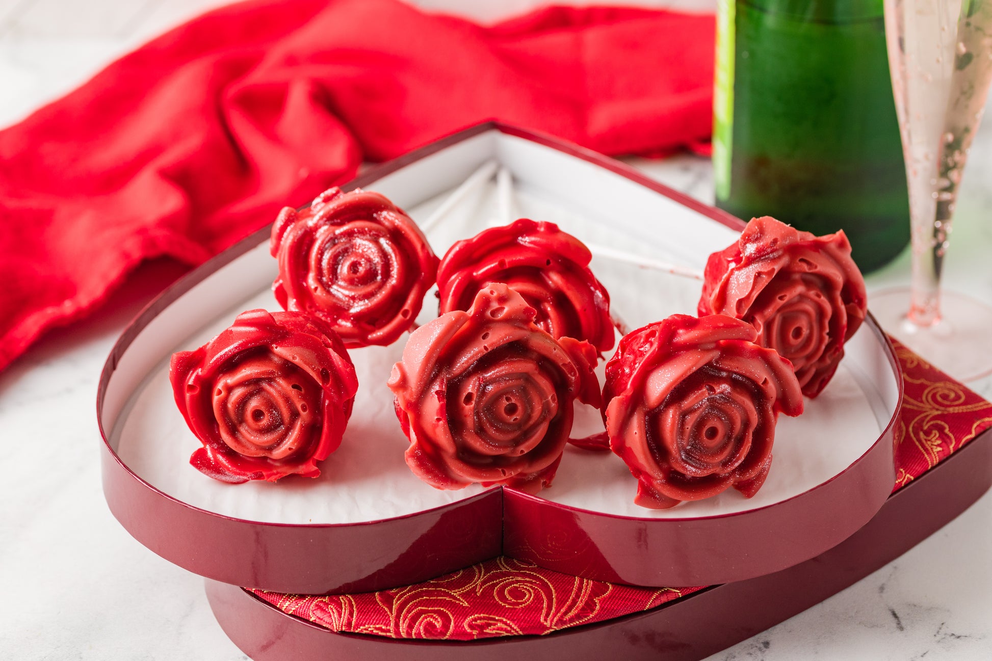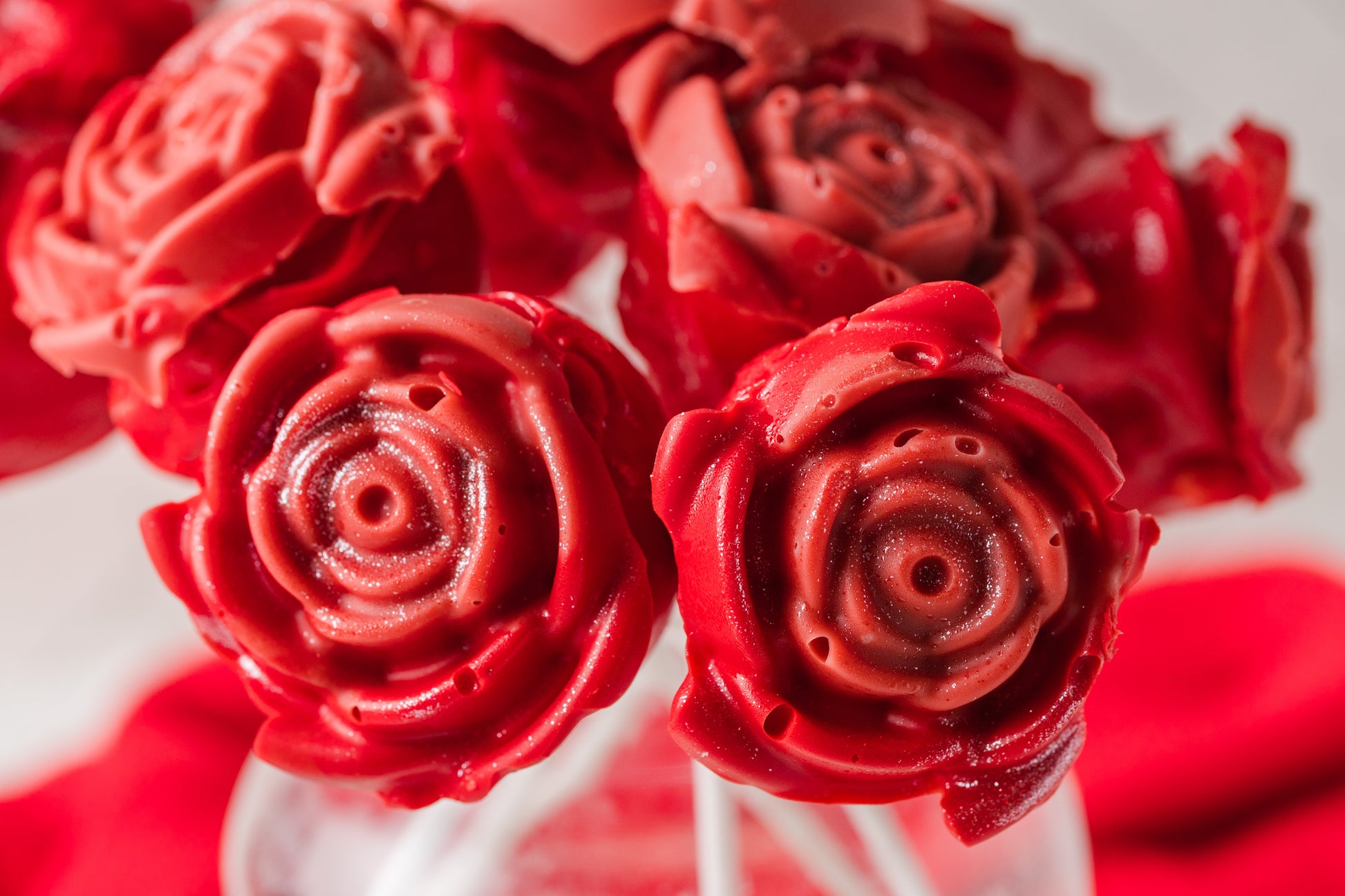 These romantic cake pops start with a freshly prepared pink velvet cake that’s rolled into bites, dipped in red candy coating, and set inside a silicone rose mold for a beautiful, three-dimensional flower effect. Once firm, each rose pop is dusted with edible red glitter for a sparkling, show-stopping finish.