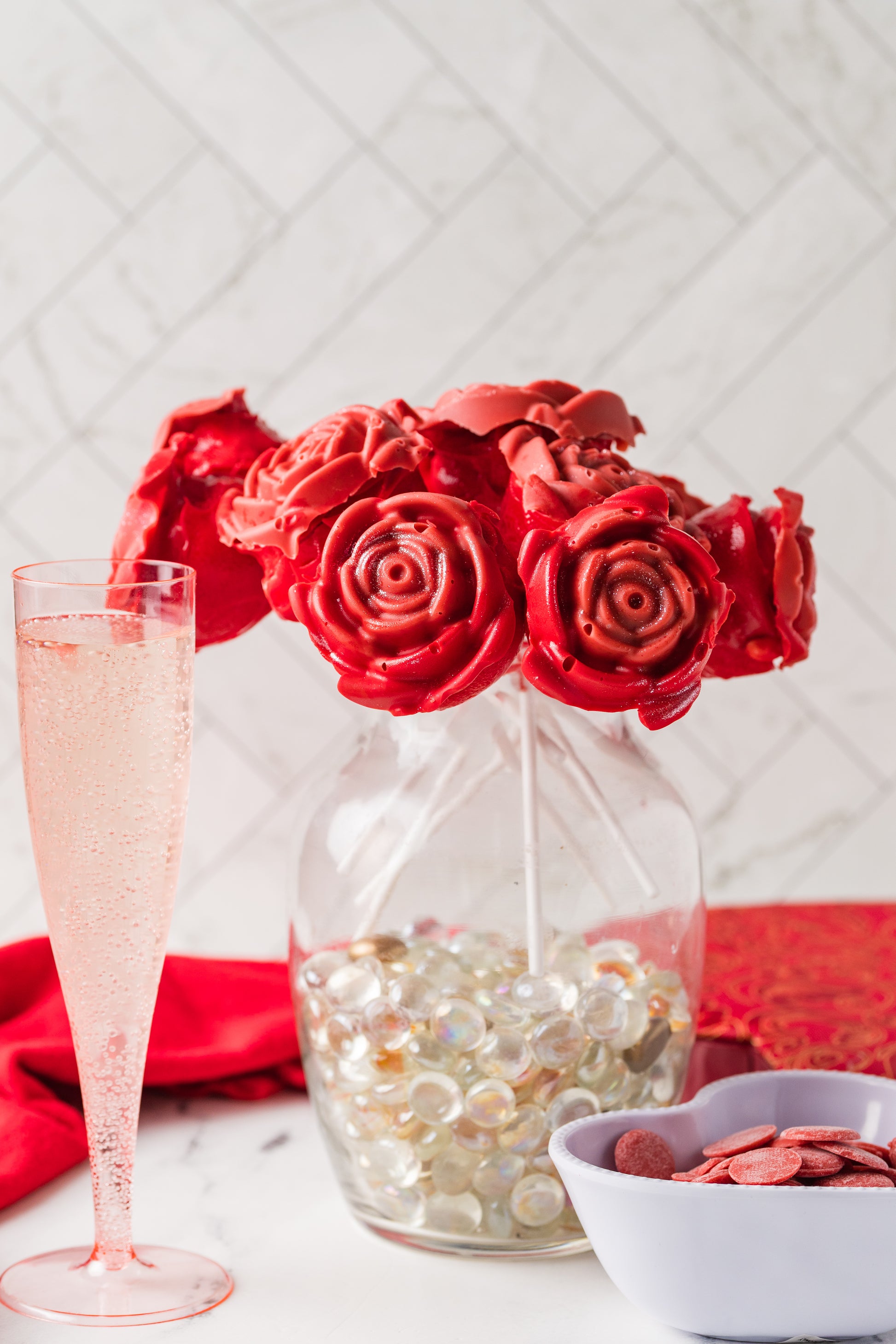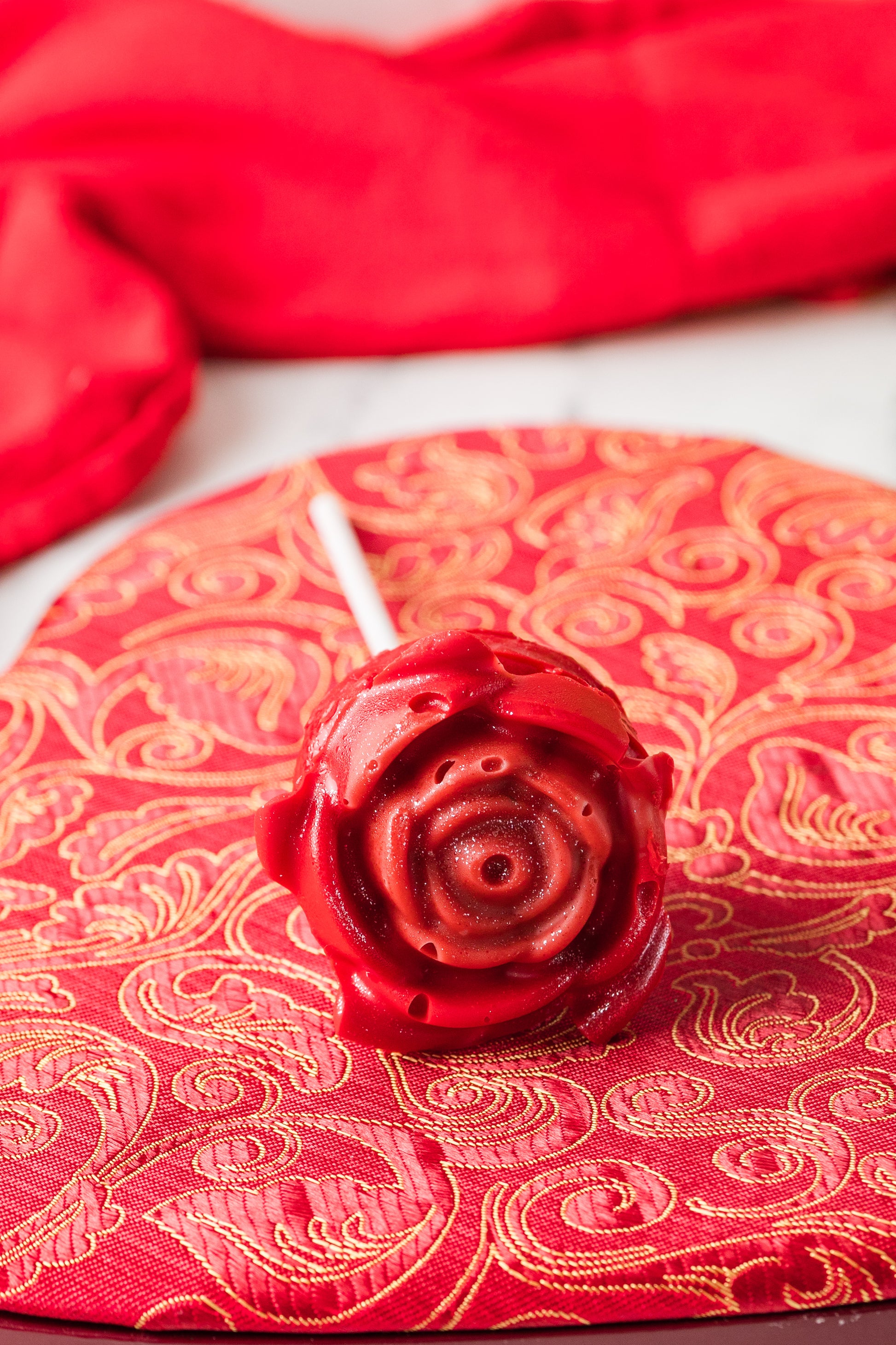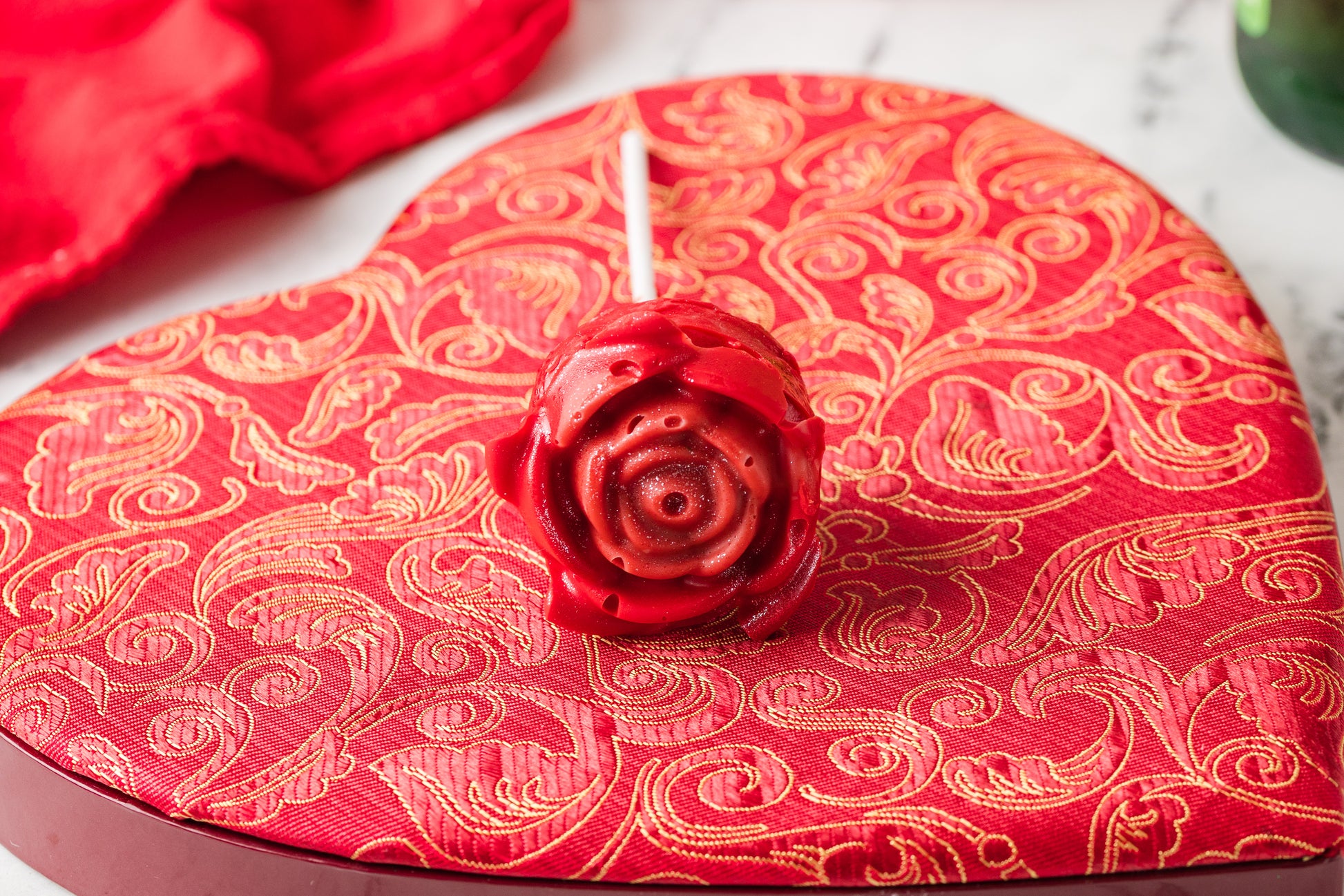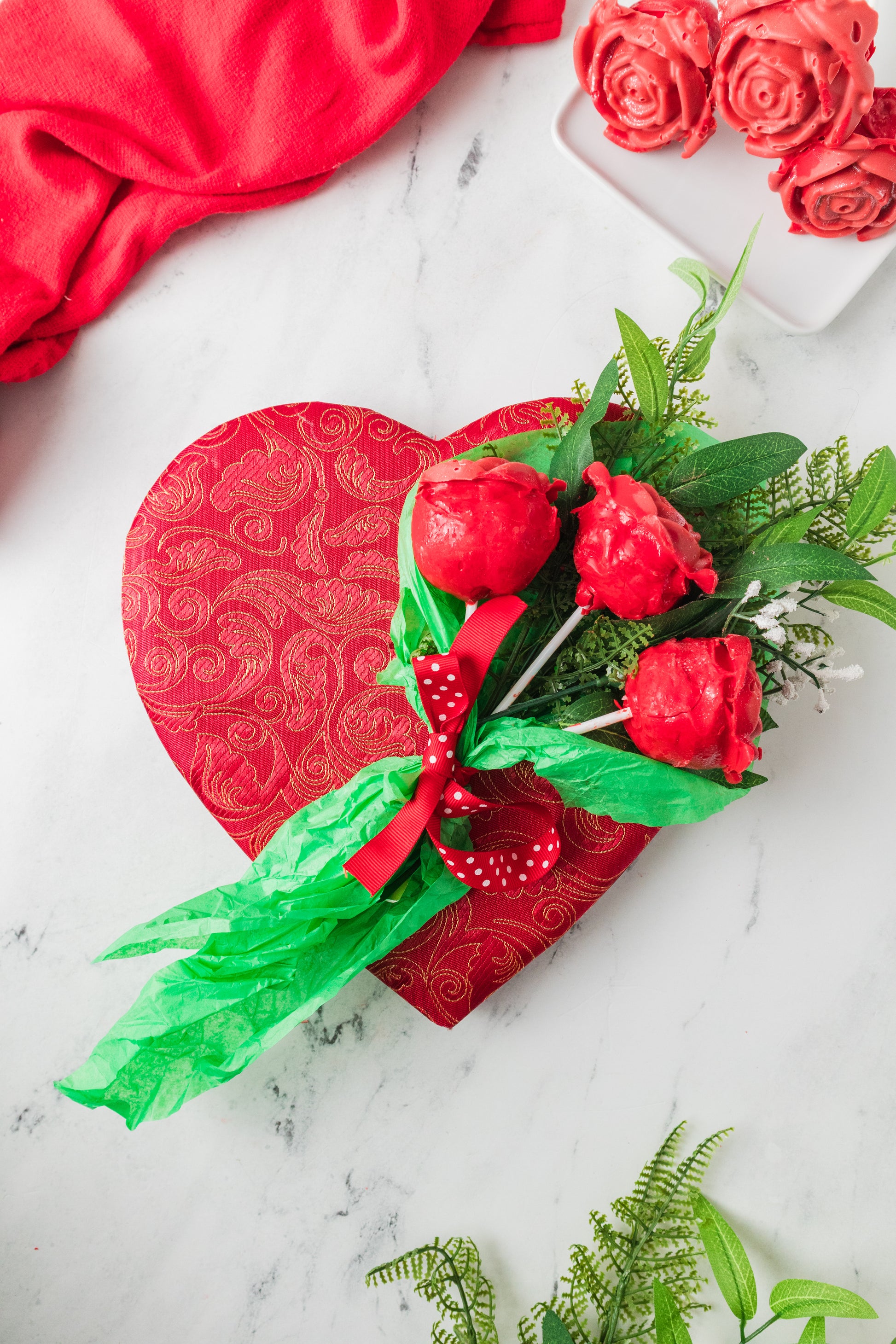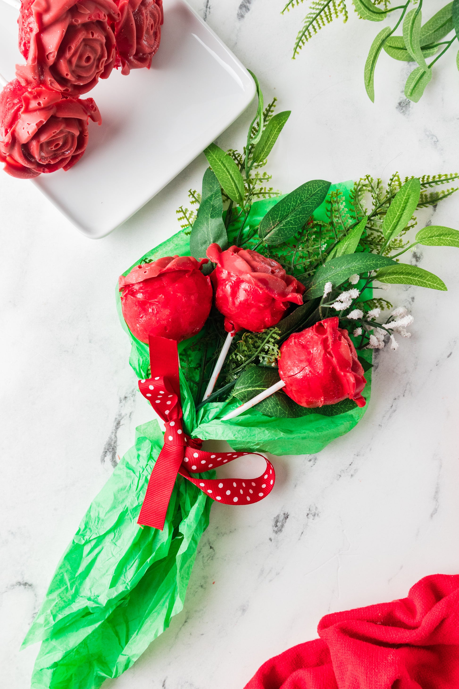 These romantic cake pops start with a freshly prepared pink velvet cake that’s rolled into bites, dipped in red candy coating, and set inside a silicone rose mold for a beautiful, three-dimensional flower effect. Once firm, each rose pop is dusted with edible red glitter for a sparkling, show-stopping finish.