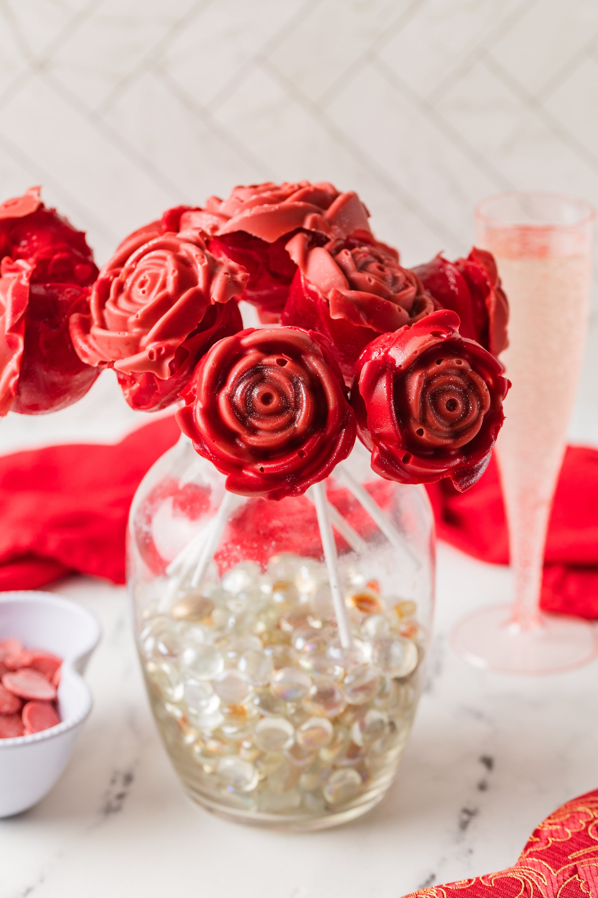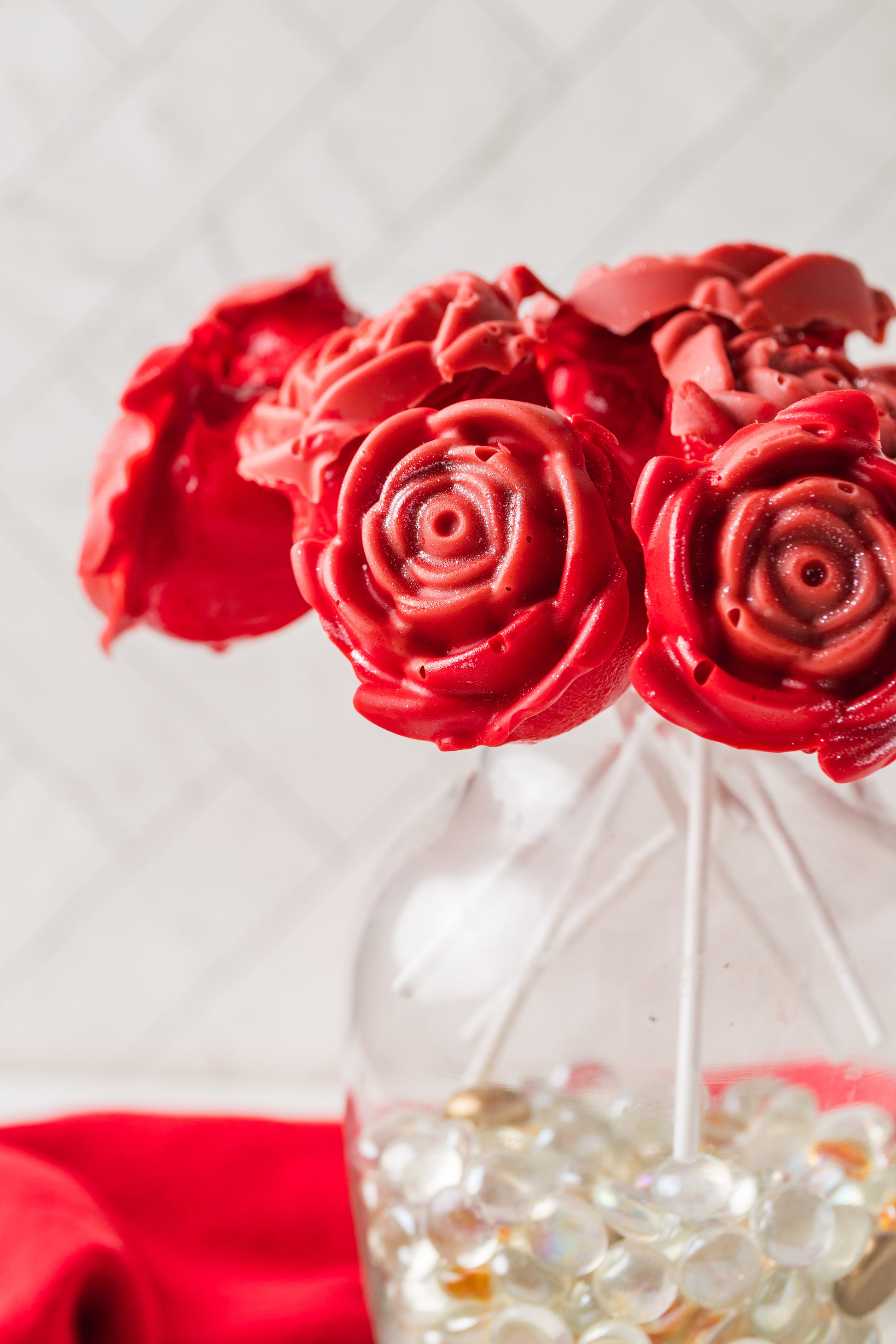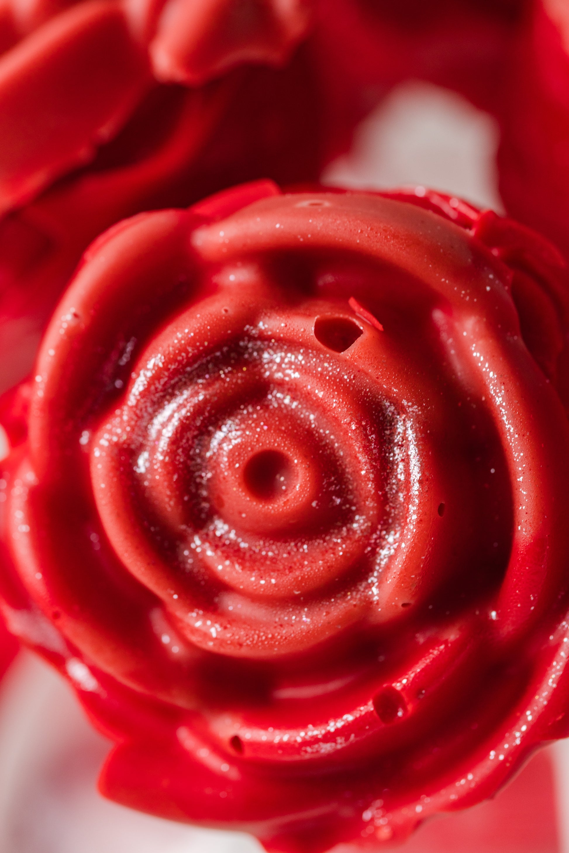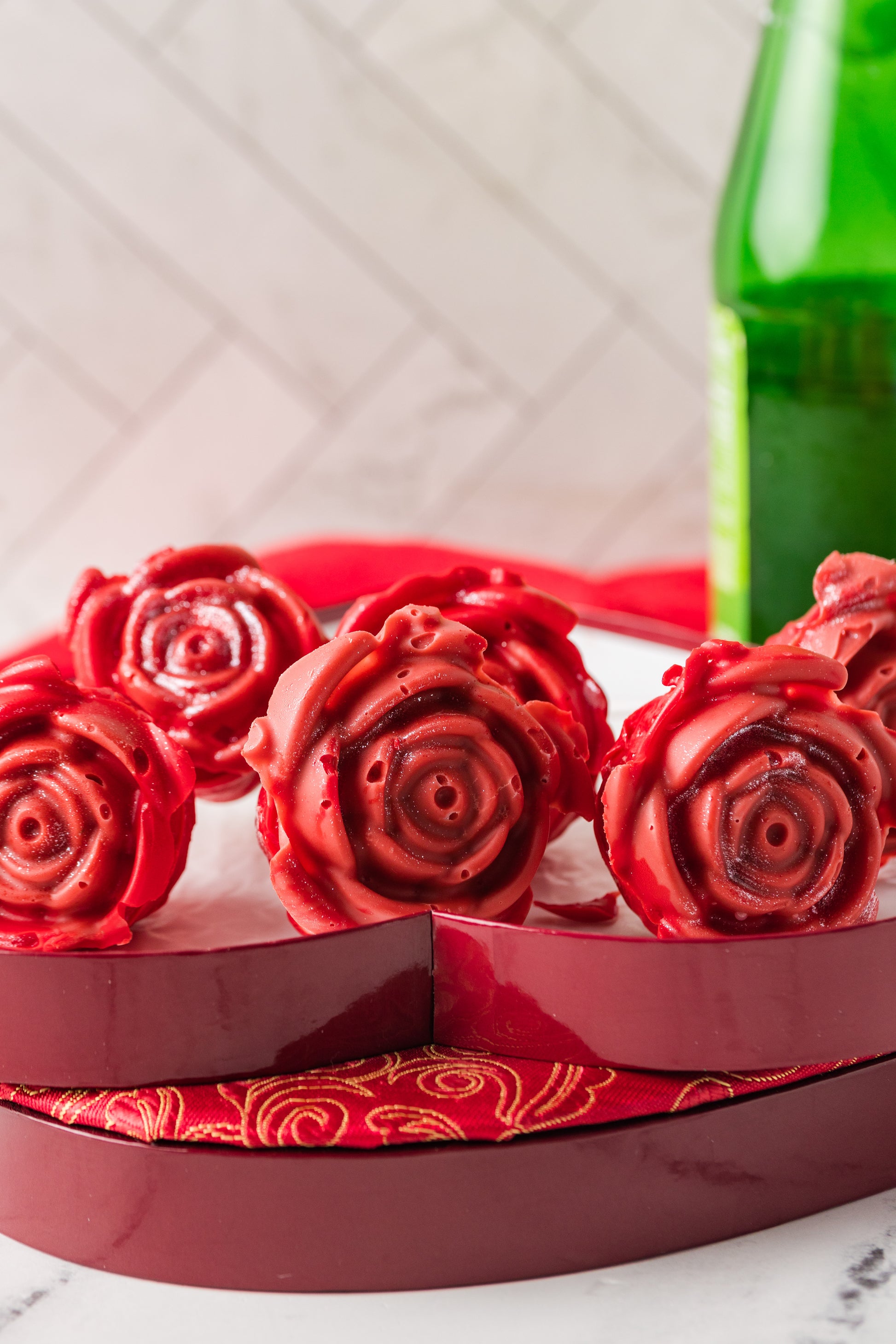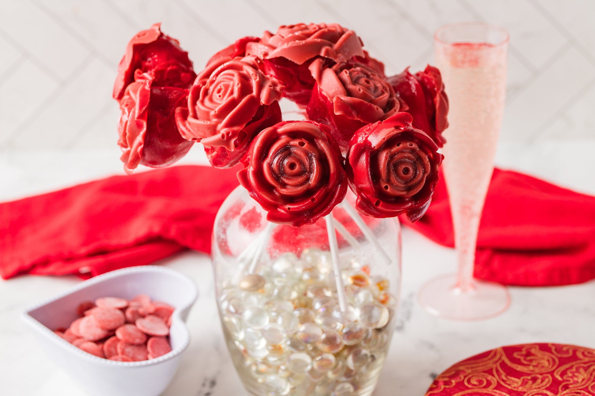 These romantic cake pops start with a freshly prepared pink velvet cake that’s rolled into bites, dipped in red candy coating, and set inside a silicone rose mold for a beautiful, three-dimensional flower effect. Once firm, each rose pop is dusted with edible red glitter for a sparkling, show-stopping finish.