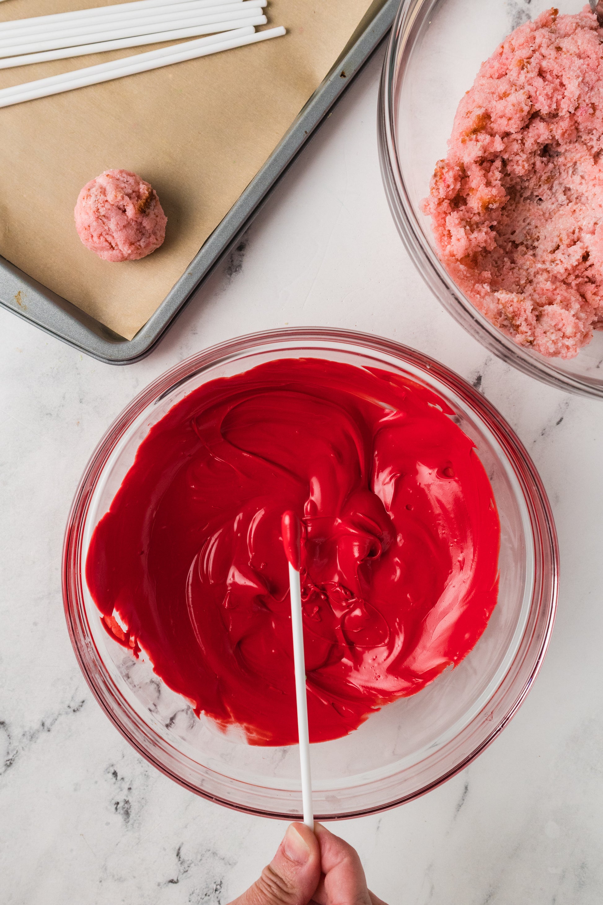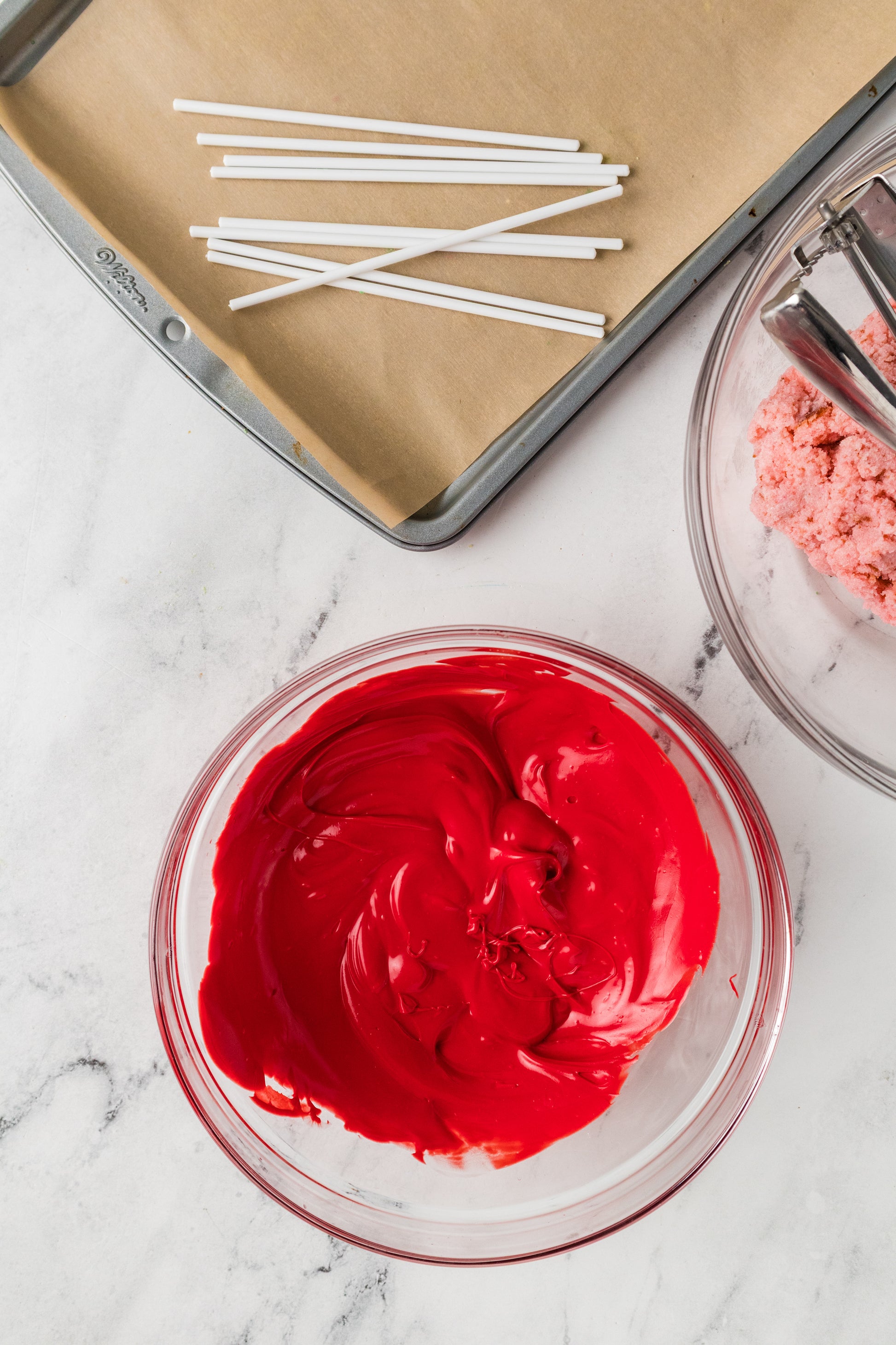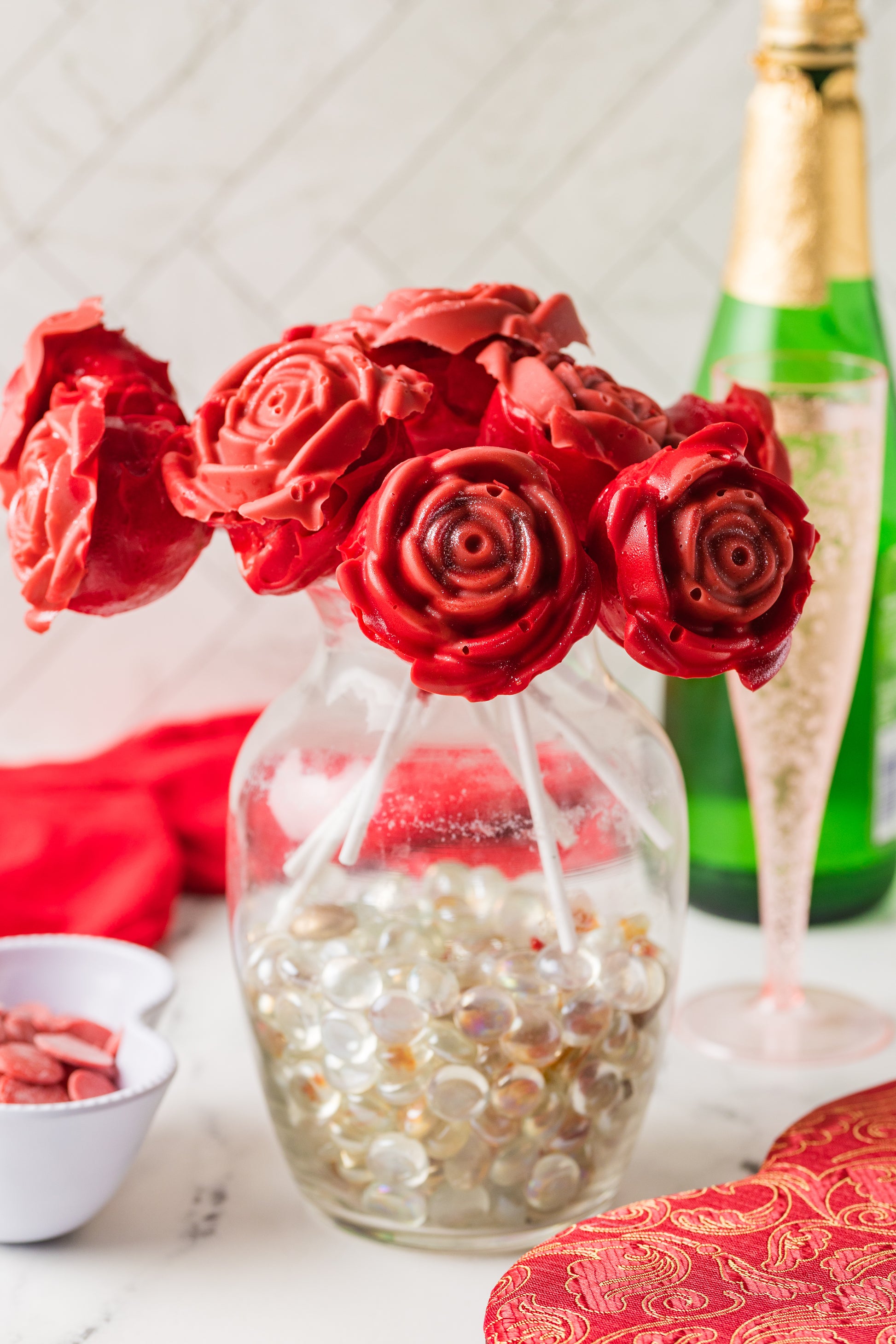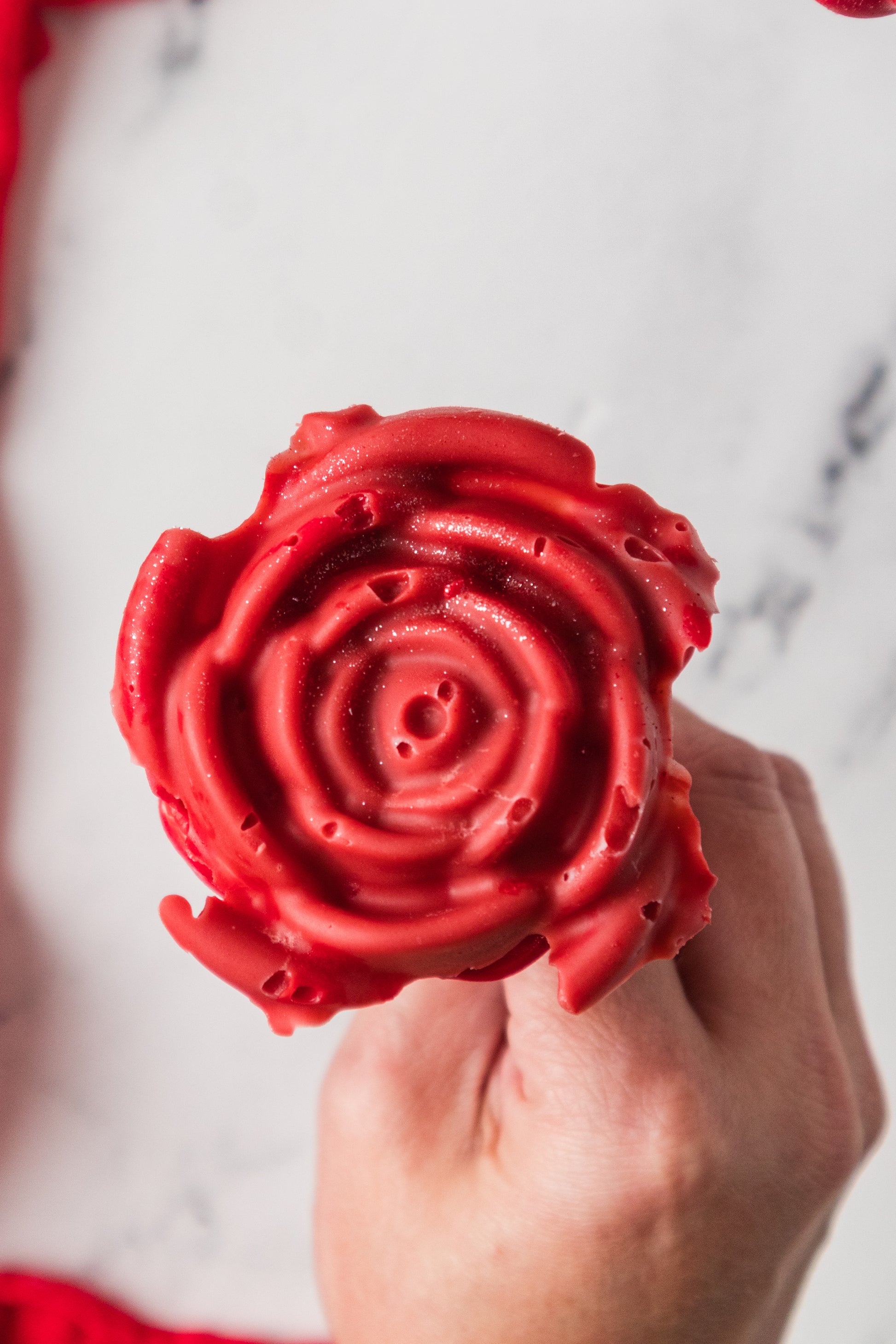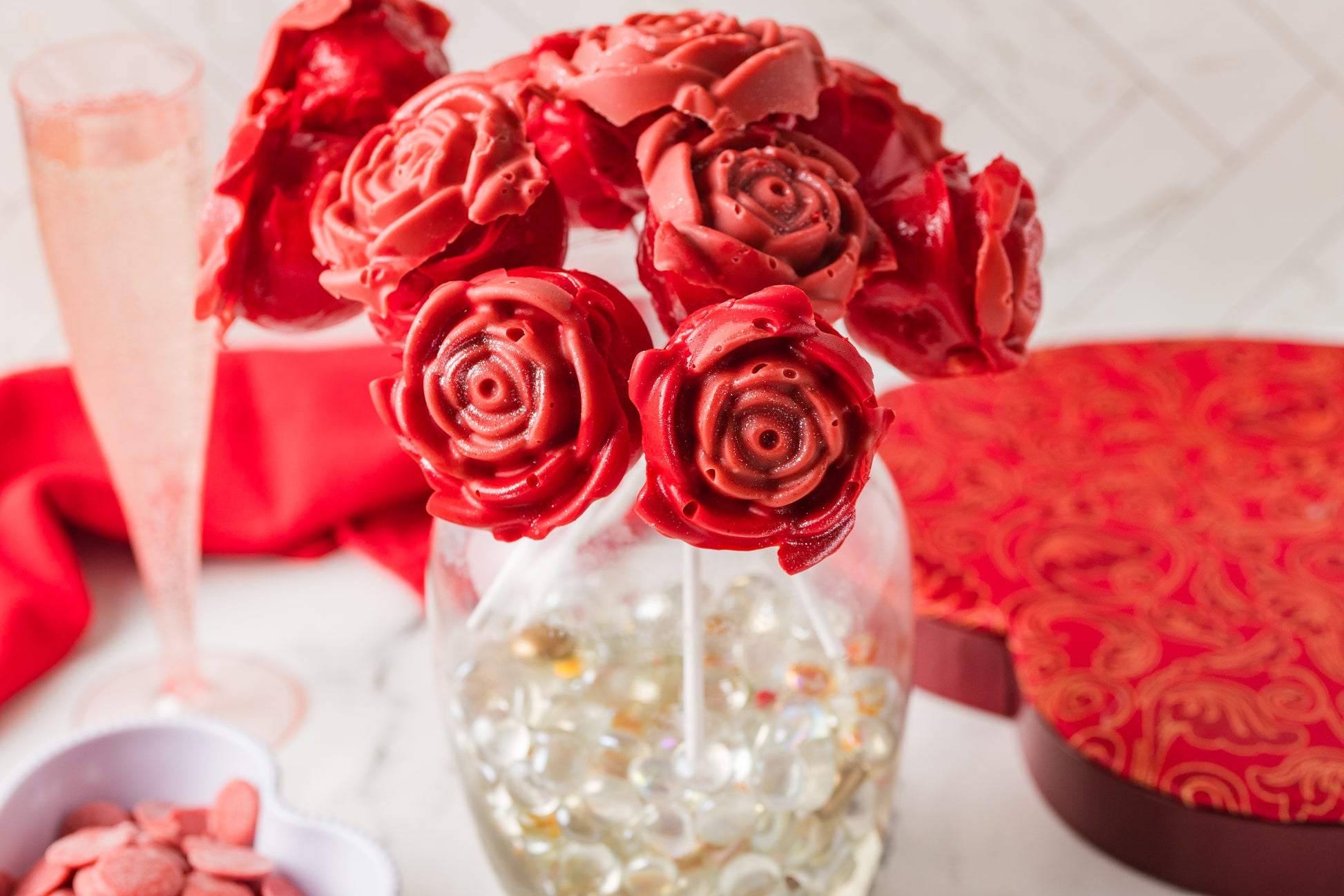 These romantic cake pops start with a freshly prepared pink velvet cake that’s rolled into bites, dipped in red candy coating, and set inside a silicone rose mold for a beautiful, three-dimensional flower effect. Once firm, each rose pop is dusted with edible red glitter for a sparkling, show-stopping finish.