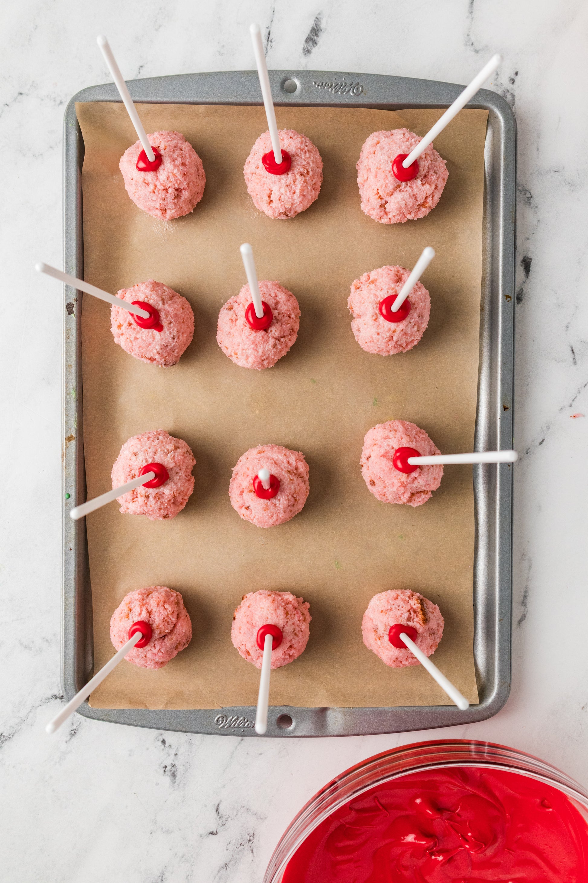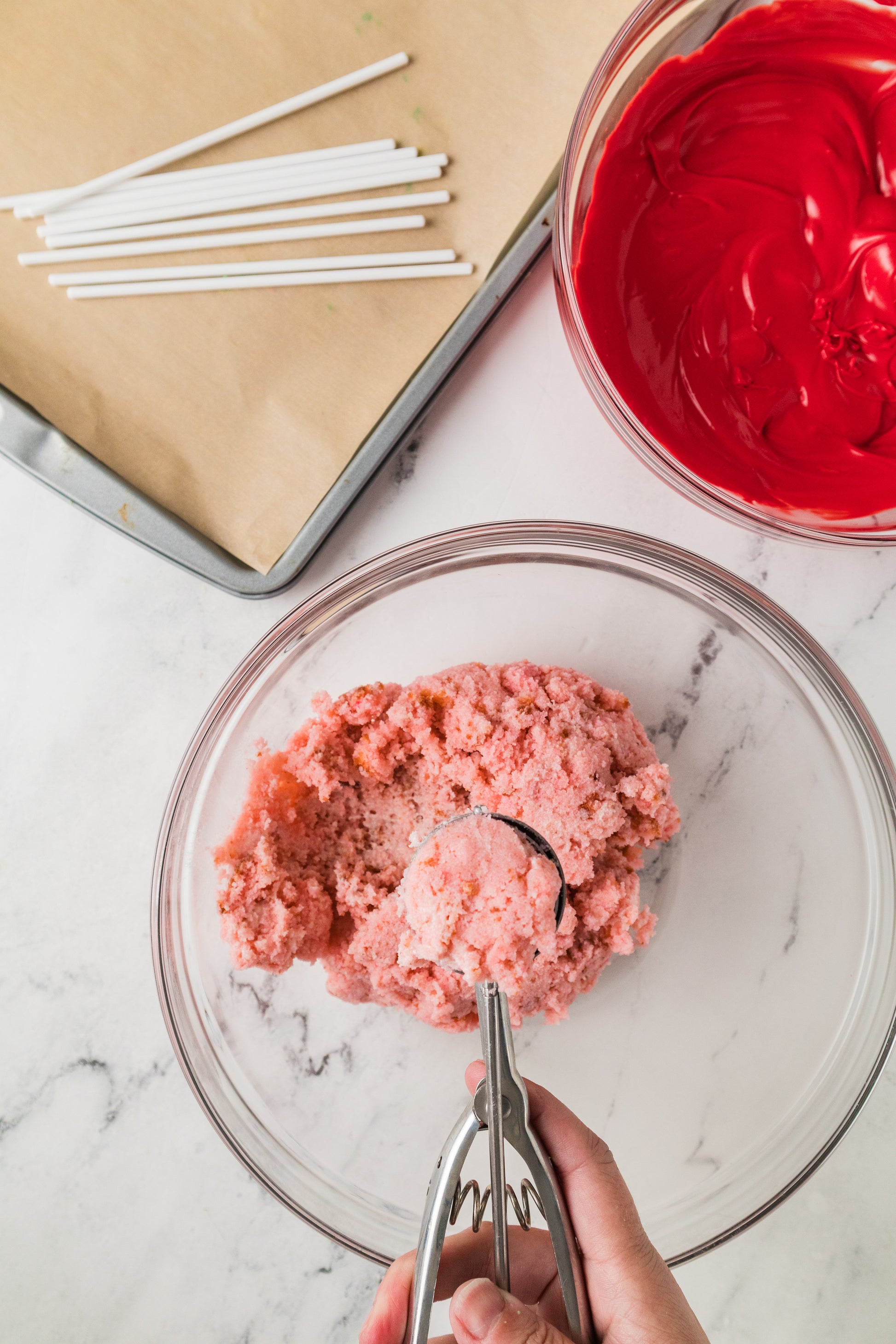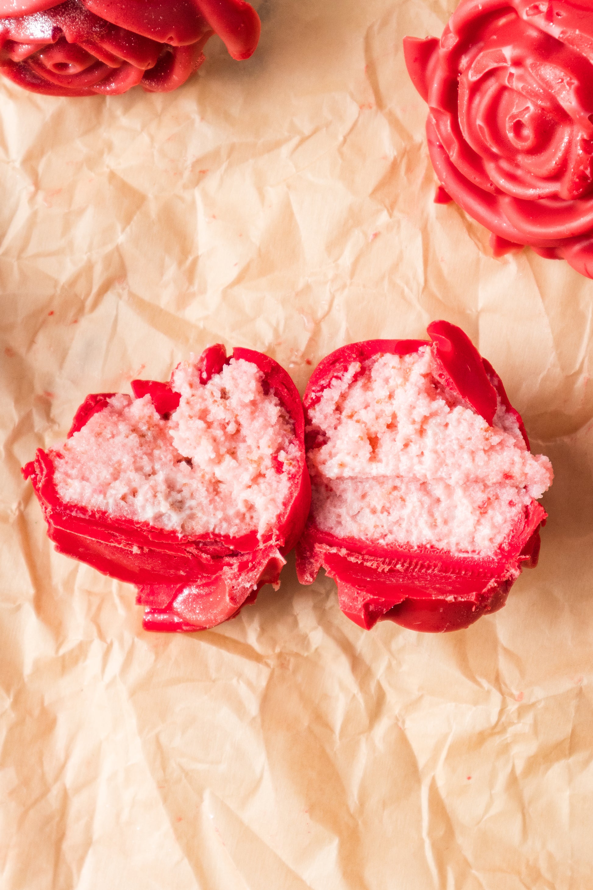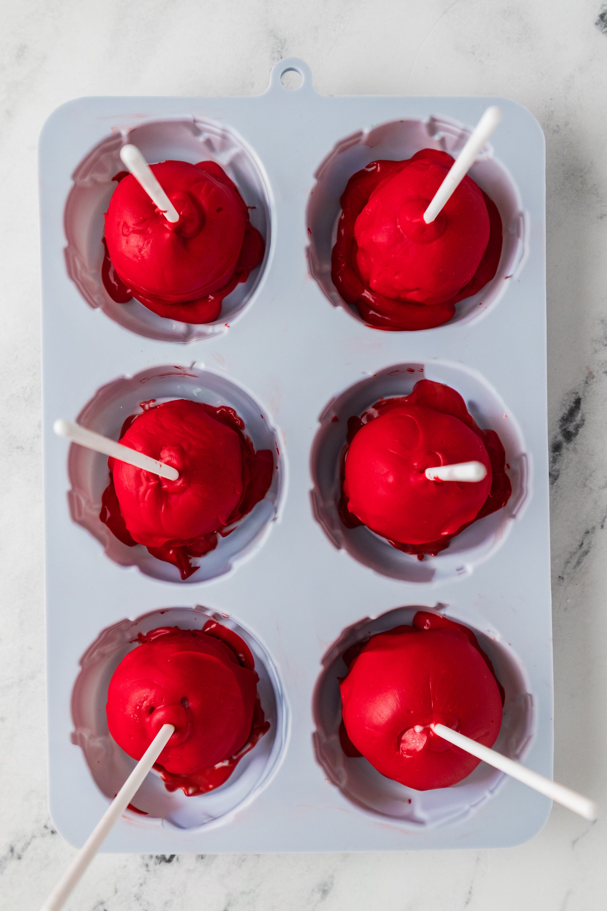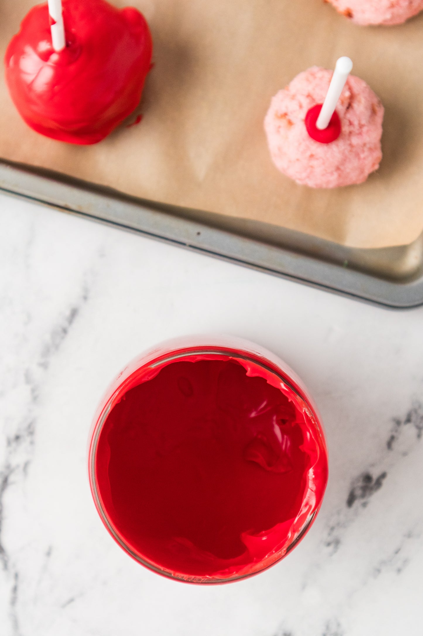These romantic cake pops start with a freshly prepared pink velvet cake that’s rolled into bites, dipped in red candy coating, and set inside a silicone rose mold for a beautiful, three-dimensional flower effect. Once firm, each rose pop is dusted with edible red glitter for a sparkling, show-stopping finish.